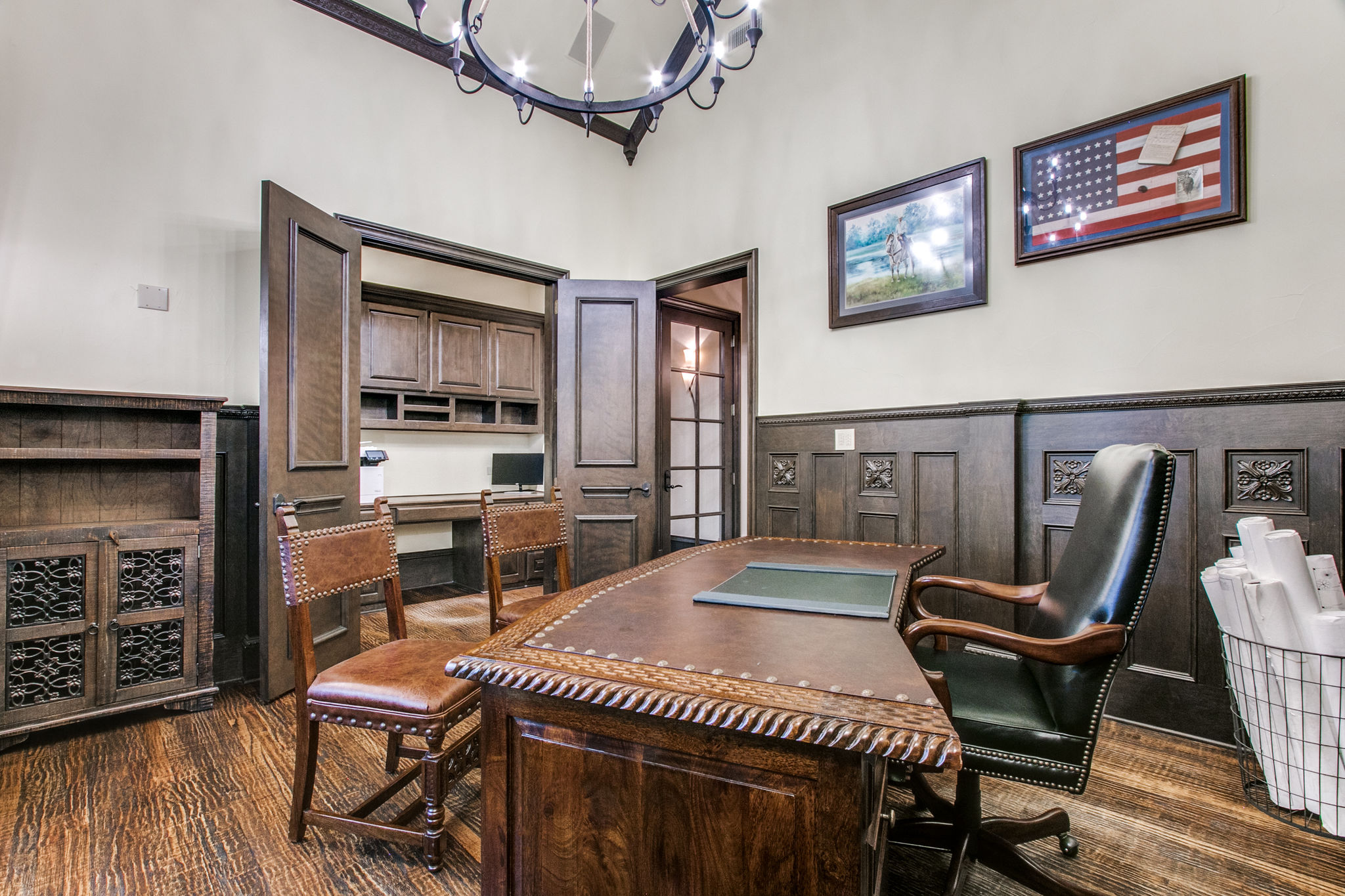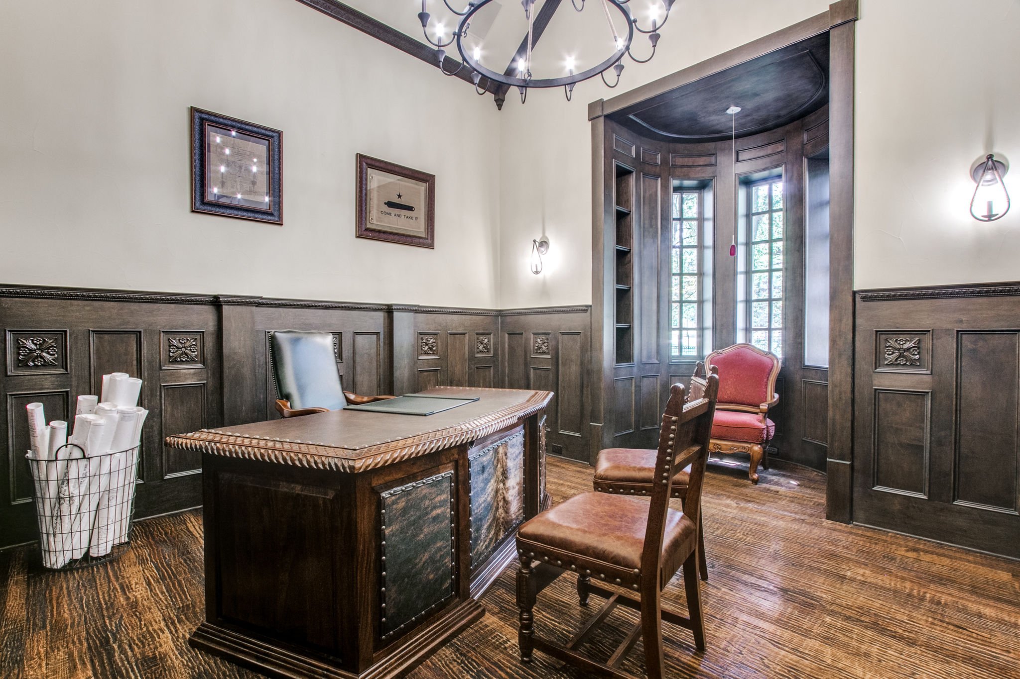 - Study / office with heavy wood paneling, sitting area and hand scrapped wood floors