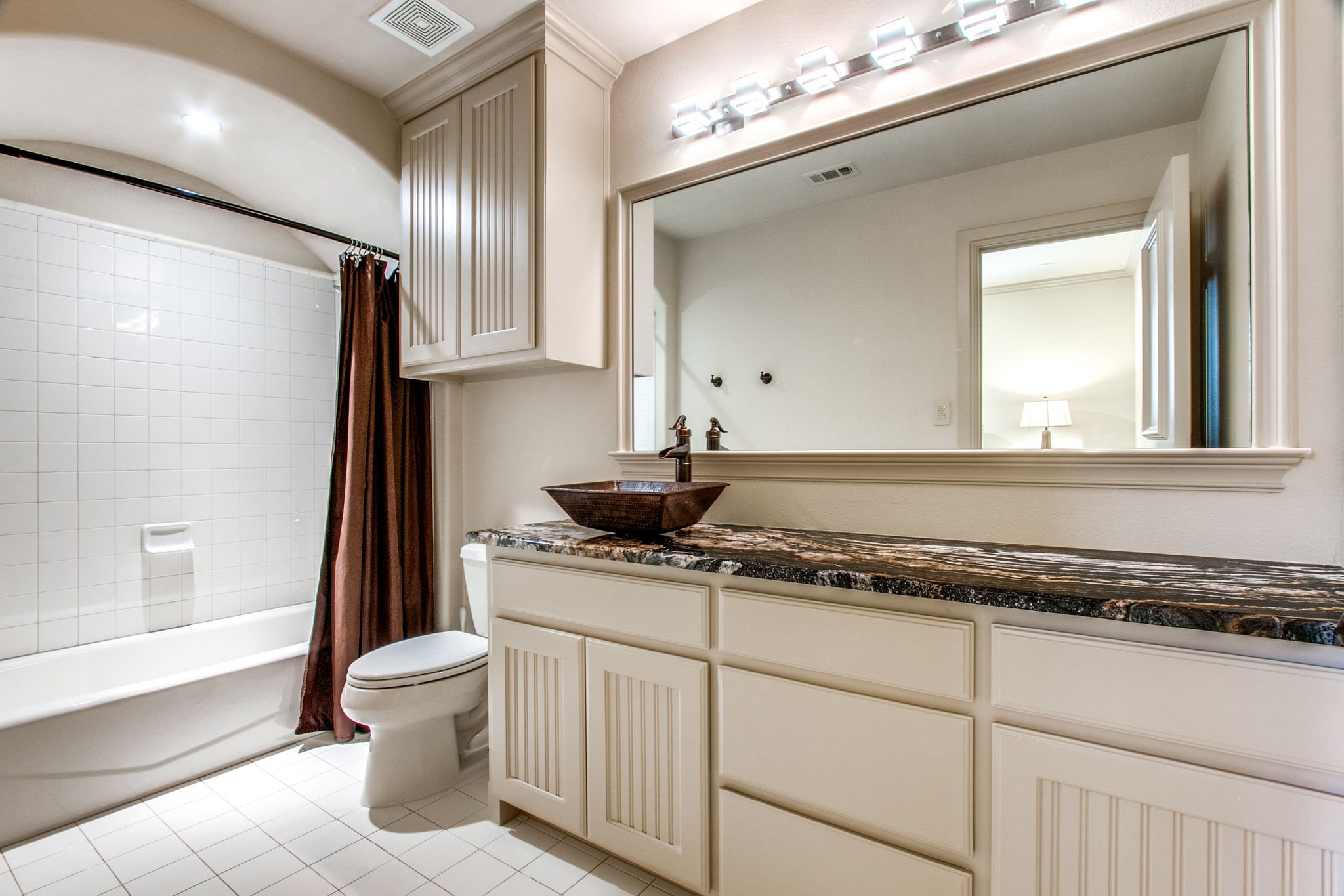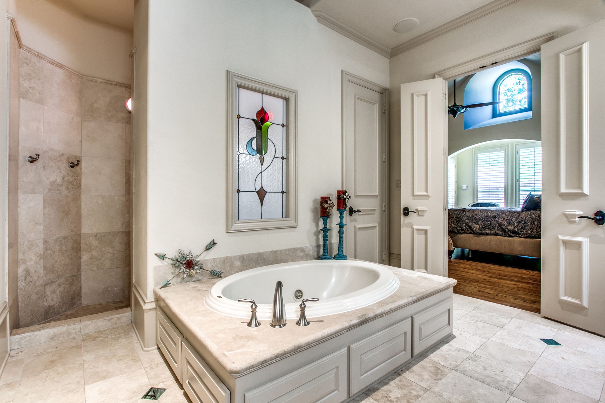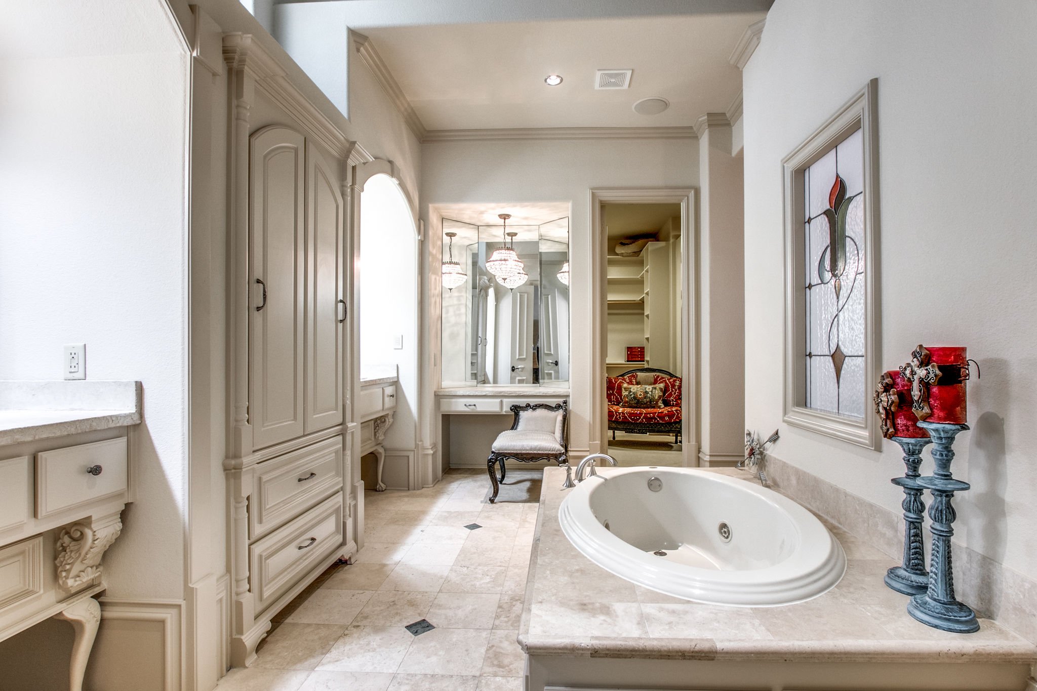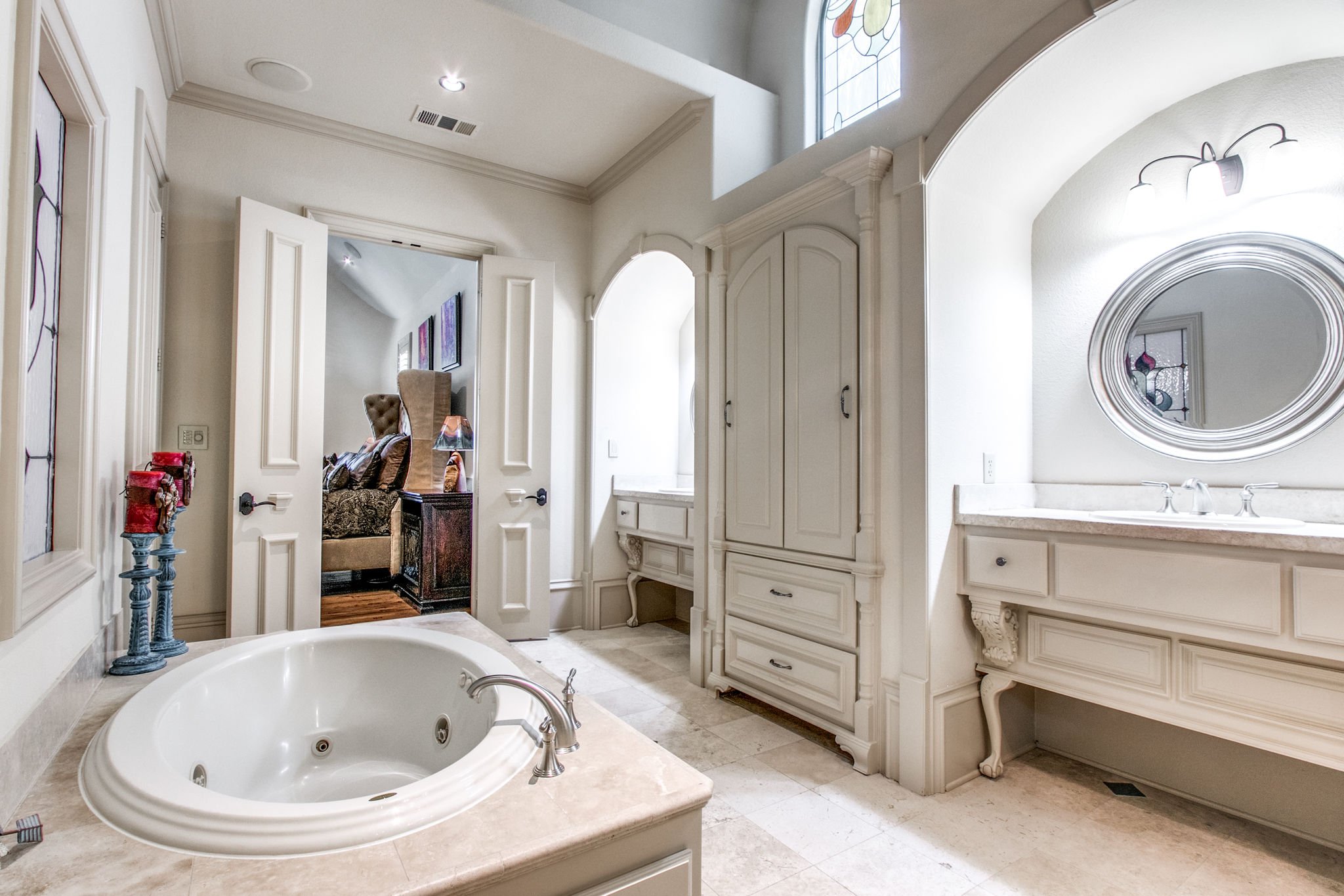 - Master bathroom has his and her sinks and dressing table with large walking shower, jetted garden tub