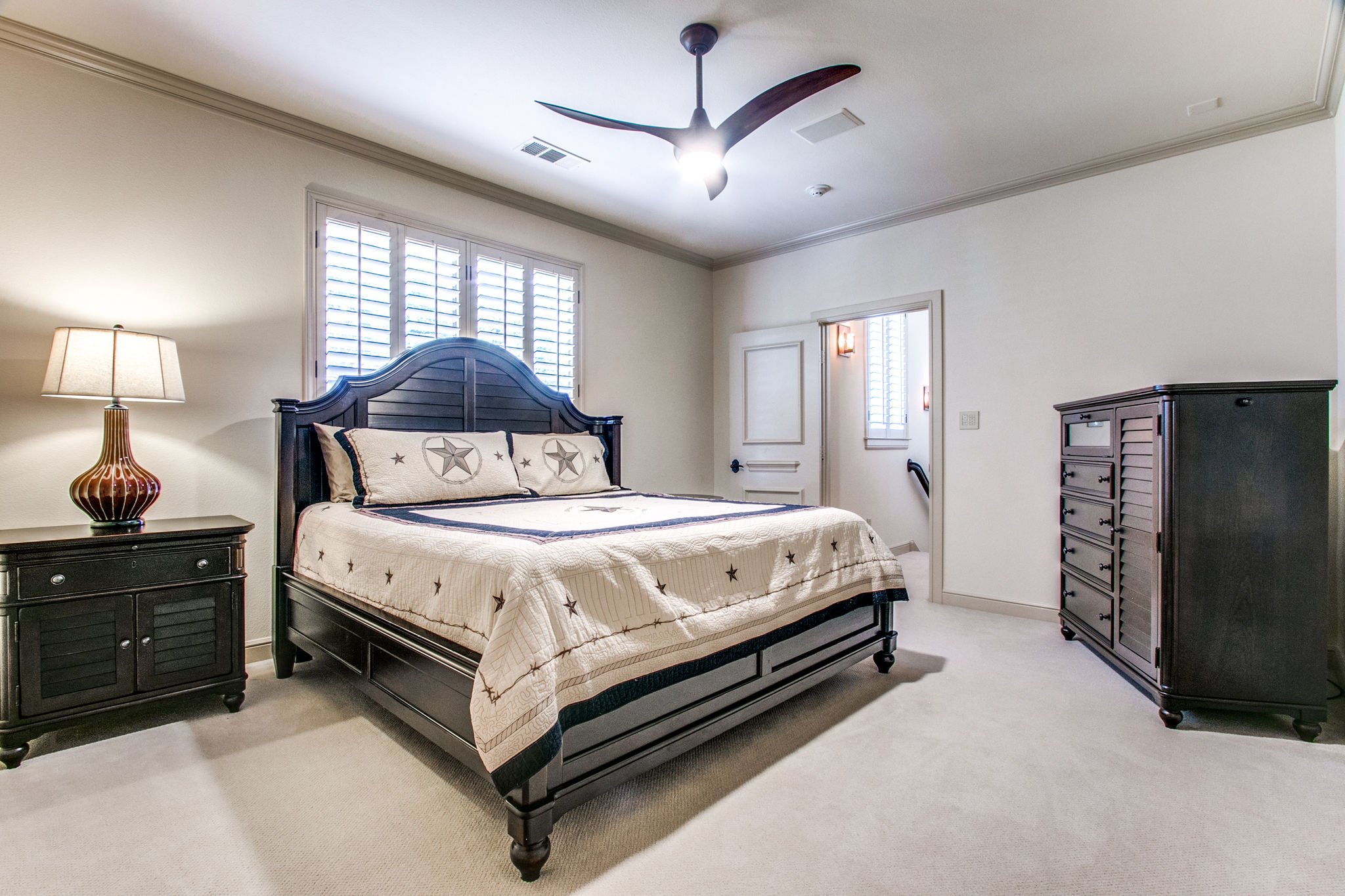 - Vaulted ceiling in master bedroom with sitting area and exterior door into backyard courtyard